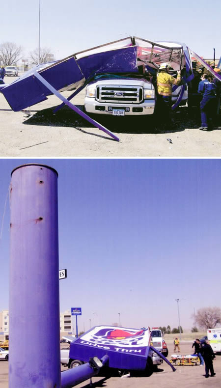 Diana Durre faleceu depois do enorme luminoso de 23m da Taco Bell cair em cima de sua caminhonete. O luminoso quebrou em uma junta a 4,5m acima do solo, devido aos ventos fortes.
